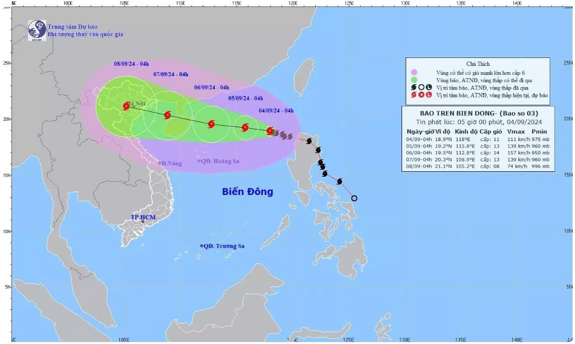 Theo Trung tâm Dự báo Khí tượng Thủy văn Quốc gia, lúc 10h ngày 4/9, vị trí tâm bão số 3 (tên quốc tế là Yagi) vào khoảng 19,0 độ vĩ Bắc; 117,5 độ kinh Đông, trên vùng biển phía Đông khu vực Bắc Biển Đông, cách đảo Hải Nam (Trung Quốc) khoảng 730km về phía Đông.