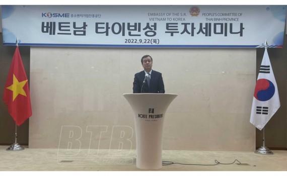 | Bí thư Tỉnh ủy Thái Bình, ông Ngô Đông Hải tại hội nghị Xúc tiến đầu tư vào Thái Bình tại Hàn Quốc (ảnh Báo Thái Bình) |