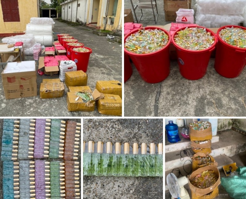 | Những lọ nước hoa giả được các đối tượng sản xuất vừa được lực lượng chức năng thu giữ (ảnh Lao động) |