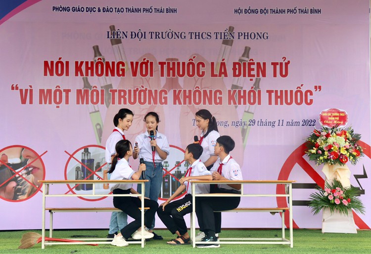 Trong đó, điển hình là Trường THCS Tiền Phong (TP. Thái Bình) là một điển hình tiêu biểu đã triển khai rất nhiều hoạt động chuyên đề về phòng, chống tác hại của thuốc lá với nhiều ý tưởng hay, sáng tạo. Trường là đơn vị tiên phong triển khai chương trình ngoại khóa: “Nói không với thuốc lá điện tử - Vì một môi trường không khói thuốc”. Chương trình đã thu hút sự tham gia của gần 800 học sinh, giáo viên, đại diện Ban giám hiệu, cán bộ tổng phụ trách các trường THCS trên địa bàn toàn thành phố, một số trường thuộc huyện Vũ Thư cùng các vị khách mời đến từ ngành y tế, ngành Công an và đại diện hội phụ huynh học sinh.