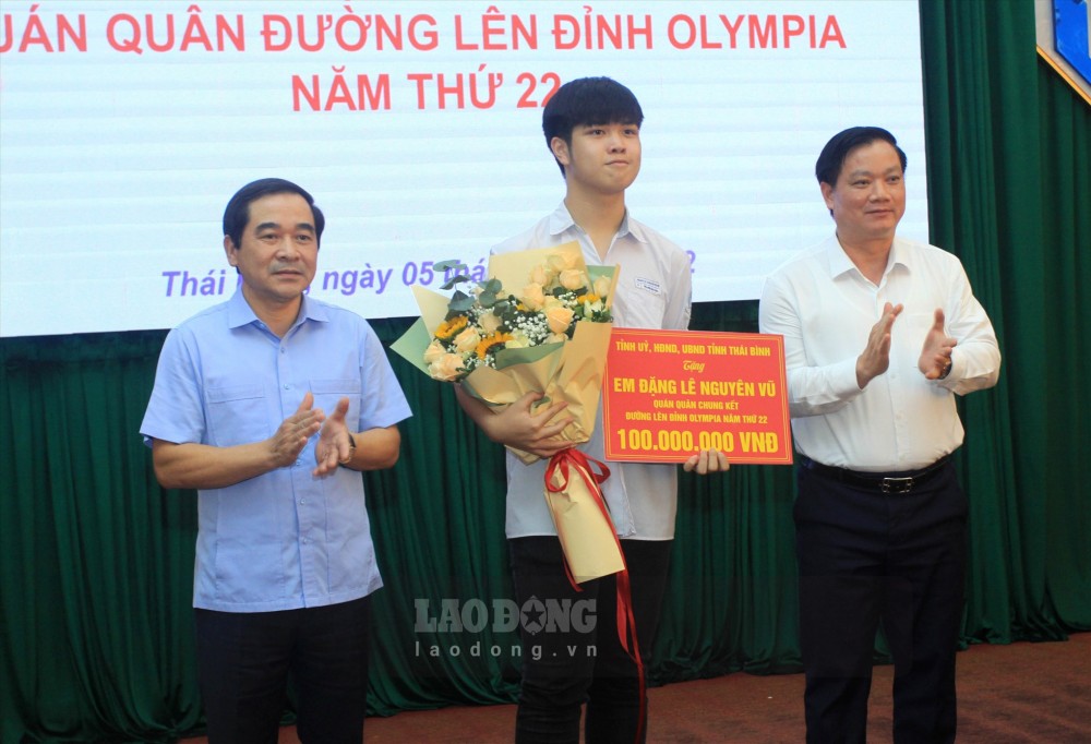 Tại buổi lễ, UBND tỉnh, Tỉnh đoàn Thái Bình trao bằng khen và tiền thưởng 100 triệu đồng cho Đặng Lê Nguyên Vũ - thí sinh đầu tiên của Thái Bình giành vòng nguyệt quế tại sân chơi trí tuệ Đường lên đỉnh Olympia.