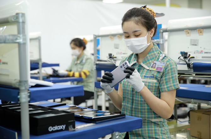 | Nhân viên sản xuất smartphone Samsung trong nhà máy tại Thái Nguyên |