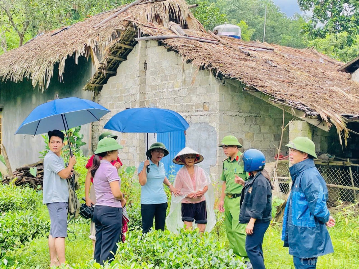 | Lực lượng công an xã Na Mao trực tiếp xuống từng hộ dân nắm bắt tình hình thiệt hại sau mưa bão để có phương án hỗ trợ |