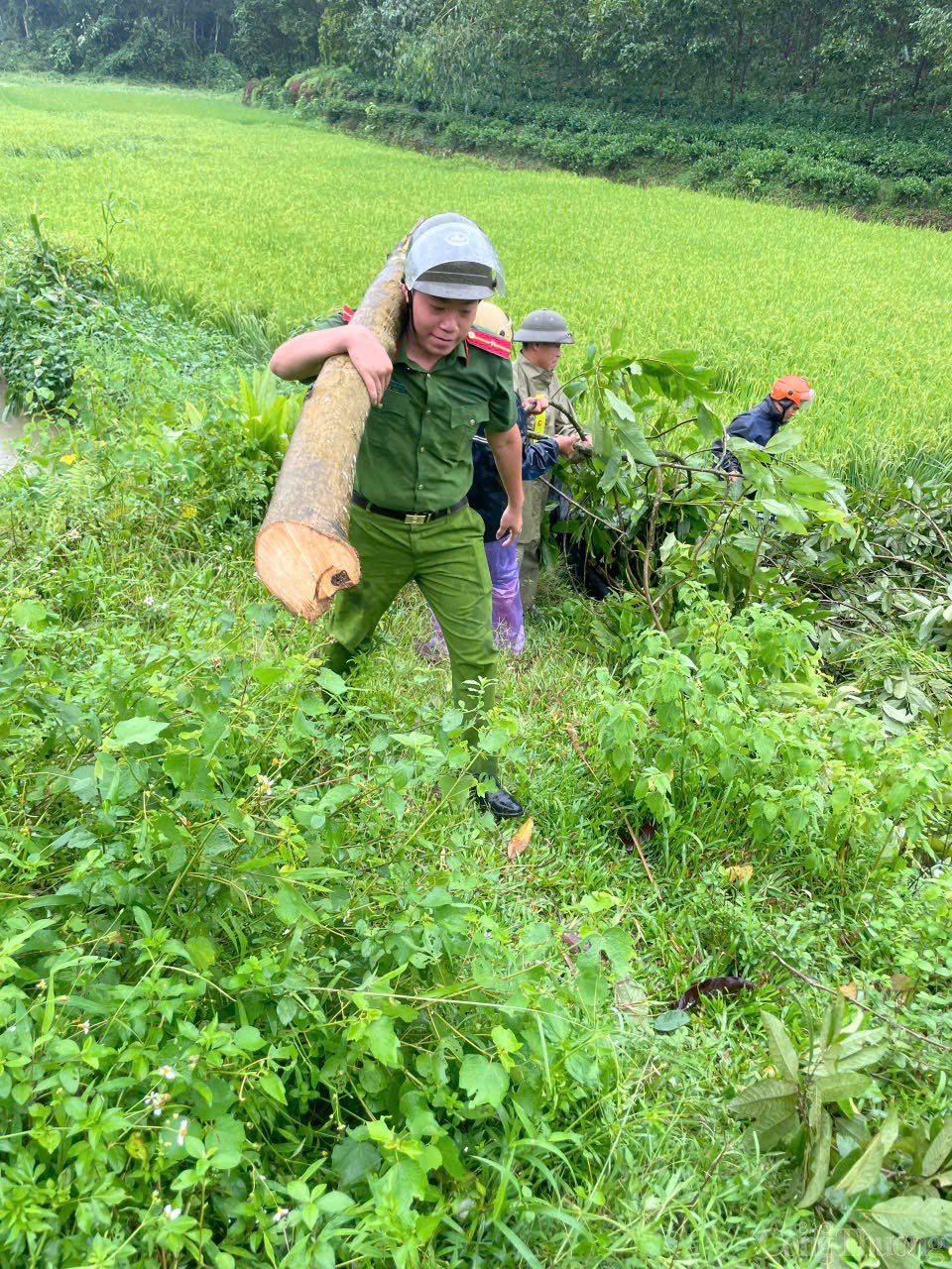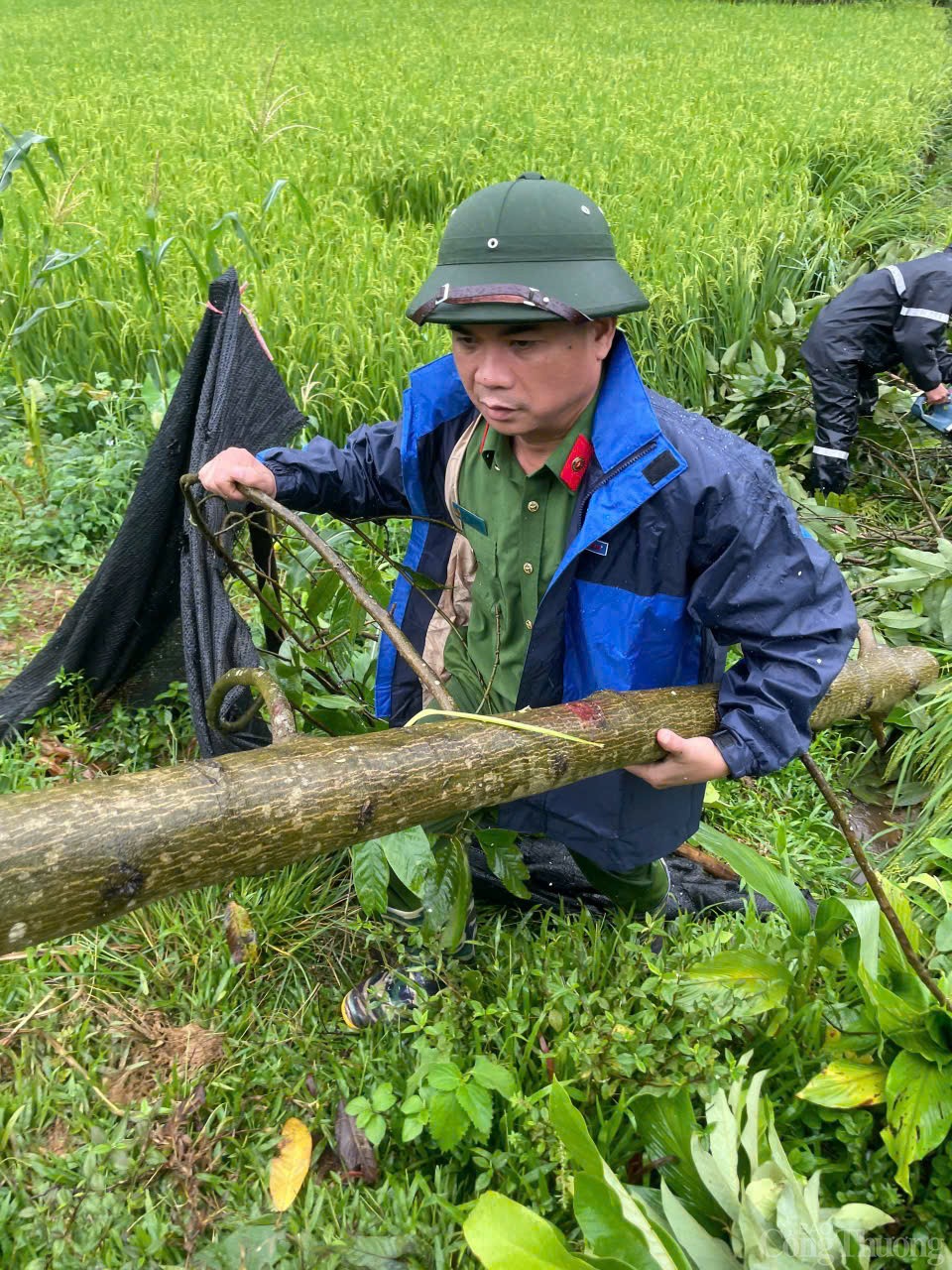 | Trưởng công an xã Na Mao trực tiếp tham gia hỗ trợ người dân khắc phục hậu quả của bão số 3 |