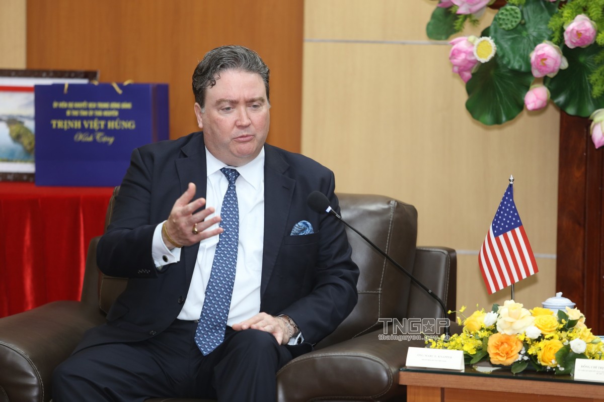 Trân trọng sự đón tiếp nồng hậu của các đồng chí lãnh đạo tỉnh Thái Nguyên, ngài Đại sứ Marc E. Knapper bày tỏ niềm vui khi được đến Thái Nguyên và chia sẻ: Những năm vừa qua, Hoa Kỳ đã hợp tác rất chặt chẽ với tỉnh Thái Nguyên; cụ thể, Đại học Thái Nguyên và Trung tâm Kiểm soát bệnh tật tỉnh về lĩnh vực giáo dục, y tế.