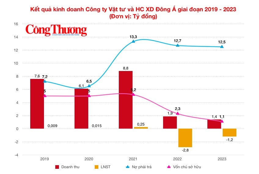 Kỳ thực, theo tài liệu Báo Công Thương tiếp cận được, giai đoạn 5 năm gần đây (2019 - 2023) doanh thu của Công ty Đông Á chưa khi nào cán mốc 10 tỷ đồng. Năm 2019, doanh nghiệp thu về 7,6 tỷ đồng, nhưng đã giảm còn 6,1 tỷ đồng ở năm kế tiếp; 2021 là năm "lên hương" nhất với doanh thu đạt 8,8 tỷ đồng, sau đó liền "rơi tự do" xuống 1,9 tỷ đồng và 1,4 tỷ đồng trong các năm 2022 - 2023.