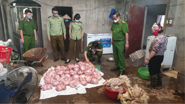 Đang trong quá trình cân, đóng bao cho lên xe ô tô mang biển kiểm soát 29H-487.47 để vận chuyển về Sóc Sơn, Hà Nội thì bị lực lượng chức năng kiểm tra, phát hiện. Tại thời điểm làm việc, ông Nhiệm không xuất trình được bất kỳ giấy tờ gì liên quan đến nguồn gốc, xuất xứ của số gà trên và hoạt động giết mổ gia cầm của gia đình ông chưa được cấp có thẩm quyền cấp phép.