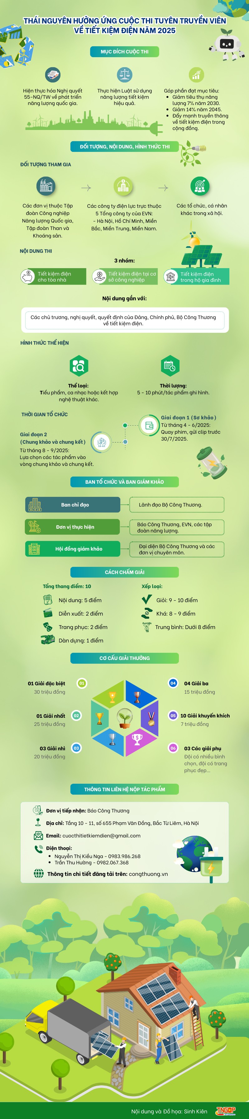Cuộc thi “Tuyên truyền viên Tiết kiệm điện năm 2025” do Bộ Công Thương tổ chức, diễn ra từ tháng 4 đến tháng 9 năm 2025 với quy mô toàn quốc. Đối tượng dự thi bao gồm các công ty điện lực thuộc 5 Tổng công ty điện lực (Hà Nội, TP. Hồ Chí Minh, miền Bắc, miền Trung, miền Nam), các đơn vị trong Tập đoàn Công nghiệp Năng lượng Quốc gia, Tập đoàn Than – Khoáng sản Việt Nam và các tổ chức, cá nhân trong xã hội.