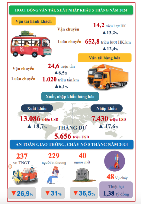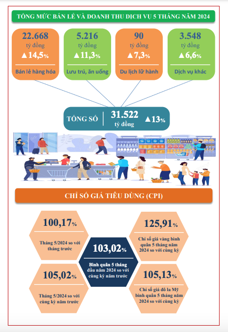 Một số mặt hàng có nhập khẩu chủ yếu 5 tháng đầu năm 2024 tăng so với cùng kỳ như: Nguyên liệu chế biến thức ăn gia súc 25,3 triệu USD, tăng 0,8%; nguyên phụ liệu dệt may 30,6 triệu USD, tăng 1,1%; giấy các loại 2,5 triệu USD, tăng 5,5%; vải các loại 80 triệu USD, tăng 10,5%; máy móc thiết bị, dụng cụ phụ tùng 66,2 triệu USD, tăng 13,6%; nguyên liệu và linh kiện điện tử 6.646 triệu USD, tăng 19%...