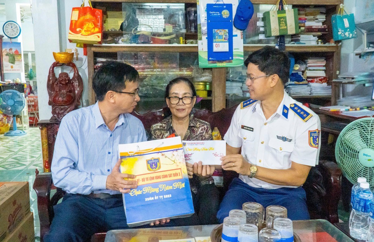 Tại các nơi đến, thay mặt Đoàn công tác, Đại tá Cao Xuân Quận, Phó Chính ủy Vùng CSB 3 đã trao tặng các phần quà Tết và gửi những lời chúc mừng năm mới tốt đẹp nhất đến quân dân huyện đảo Phú Quý.