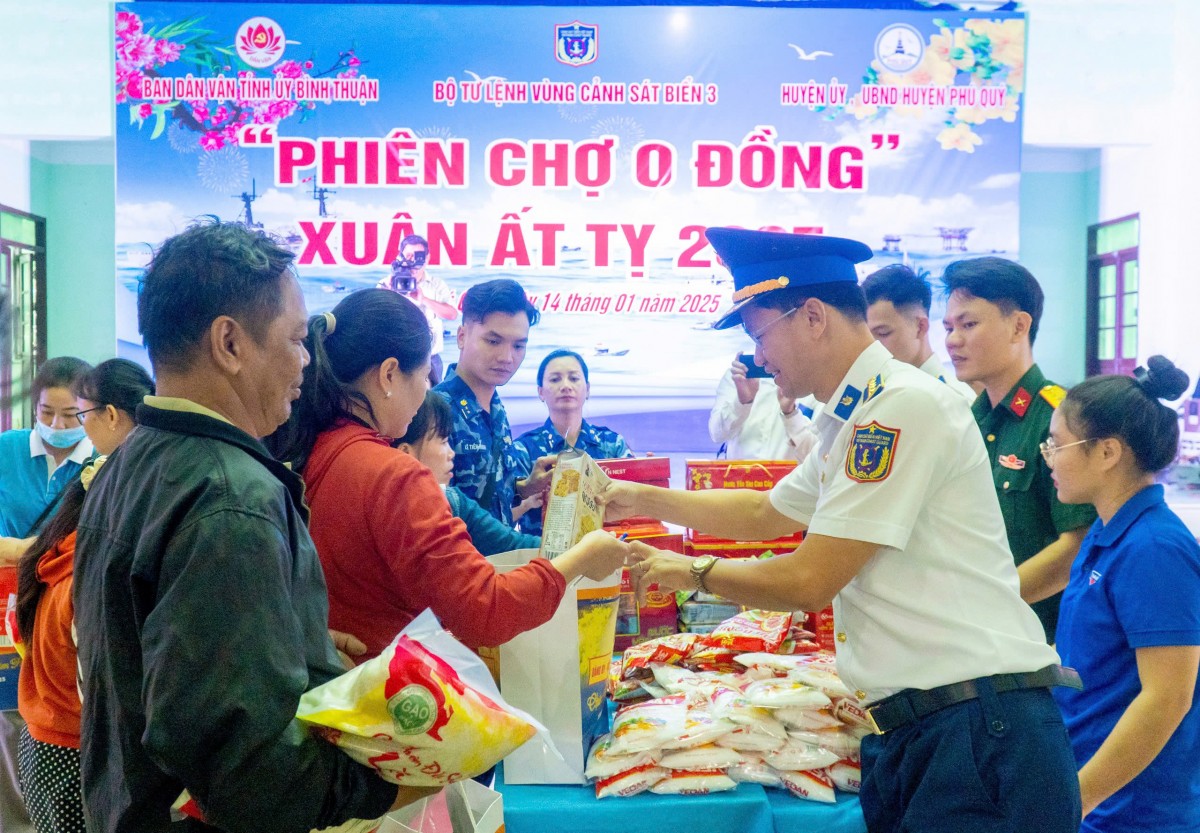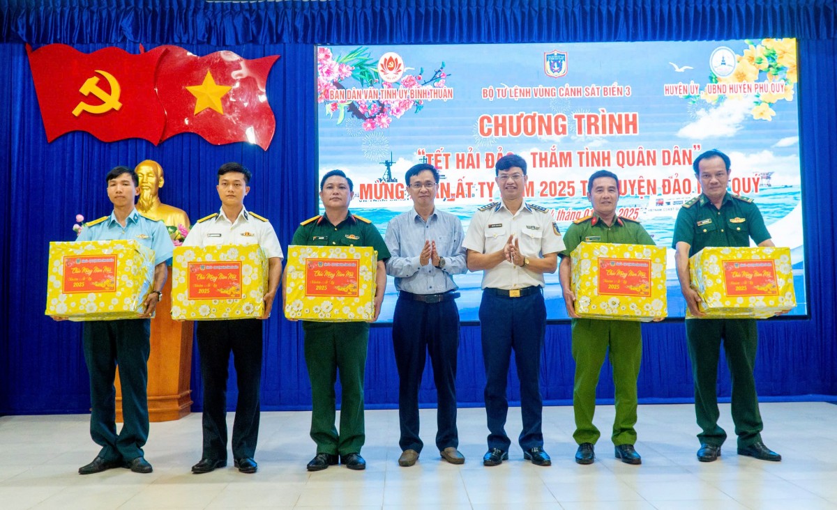Chiều cùng ngày, đã diễn ra chương trình “Phiên chợ Tết 0 đồng”, tặng 100 phiếu mua hàng miễn phí cho bà con ngư dân, gia đình chính sách có hoàn cảnh khó khăn trên địa bàn huyện đảo Phú Quý. Tối cùng ngày, chương trình được tiếp tục tổ chức với hoạt động giao lưu văn hóa nghệ thuật mang chủ đề “Tết hải đảo - Thắm tình quân dân, đón Xuân Ất Tỵ năm 2025”, trao tặng 40 suất quà cho gia đình chính sách, ngư dân, học sinh có hoàn cảnh khó khăn; tổ chức hội thi “Gói bánh chưng xanh”.