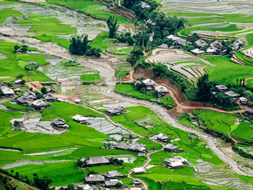 | Mênh mang lúa và nước dưới thung lũng Cao Phạ. |
