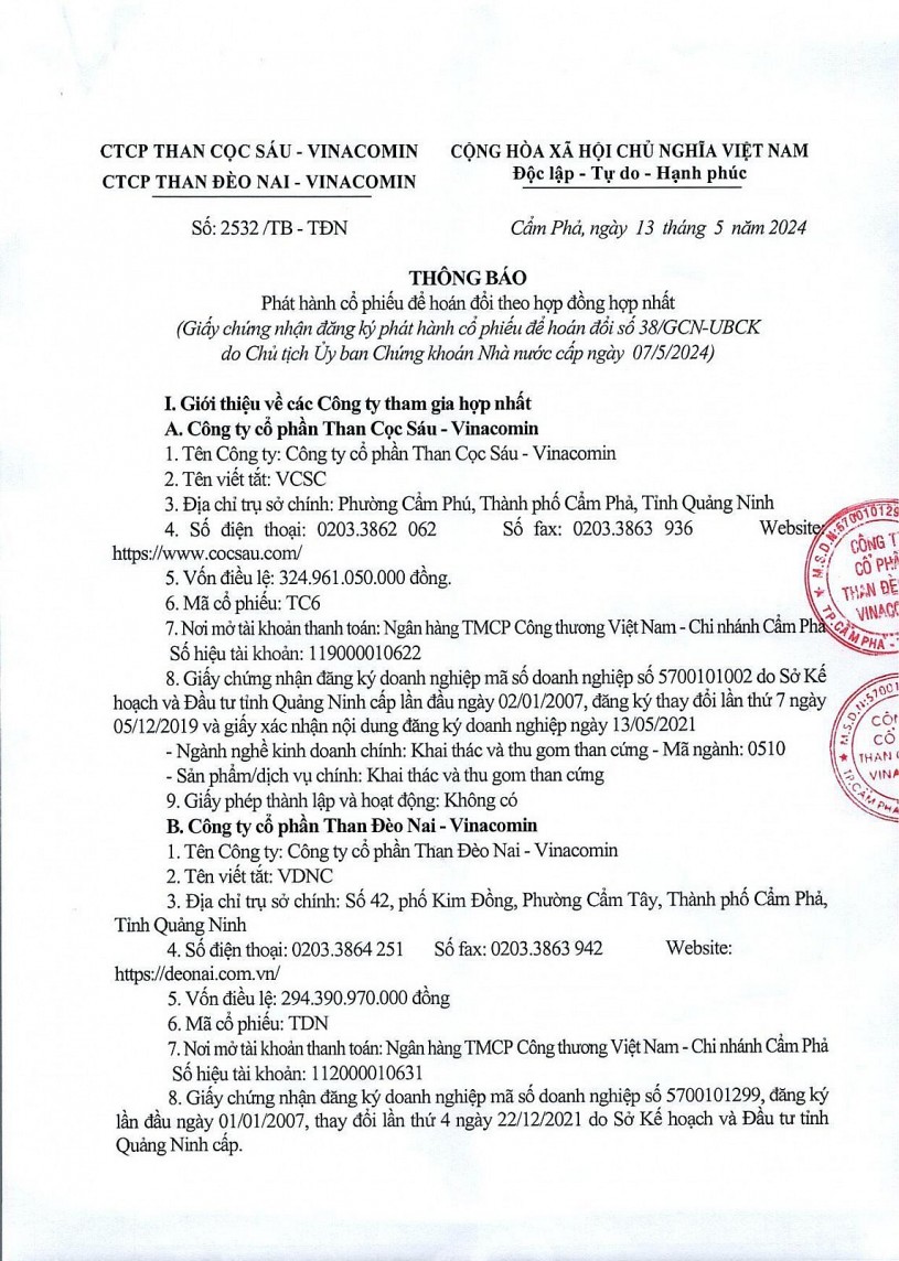 Ngày 13/5/2024, Công ty Cổ phần Than Đèo Nai-Vinacomin, Công ty Cổ phần Than Cọc Sáu-Vinacomin Thông báo phát hành cổ phiếu để hoán đổi theo hợp đồng hợp nhất.