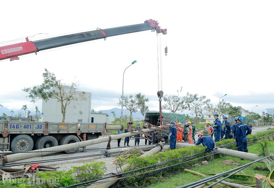 Lực lượng cán bộ, công nhân cơ điện tham gia hỗ trợ ngành điện dựng lại cột điện gãy, đổ sau bão. Ảnh: Phạm Cừ |
