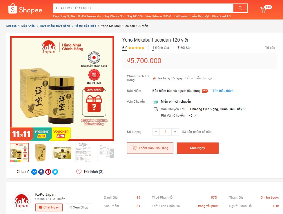 | Tại thời điểm đưa ra cảnh báo, sản phẩm Yoho Mekabu Fucoidan 120 viên xuất xứ từ Nhật Bản được rao bán trên Shopee với mức giá 5.700.000 đồng. Ảnh chụp màn hình ngày 1/11 |