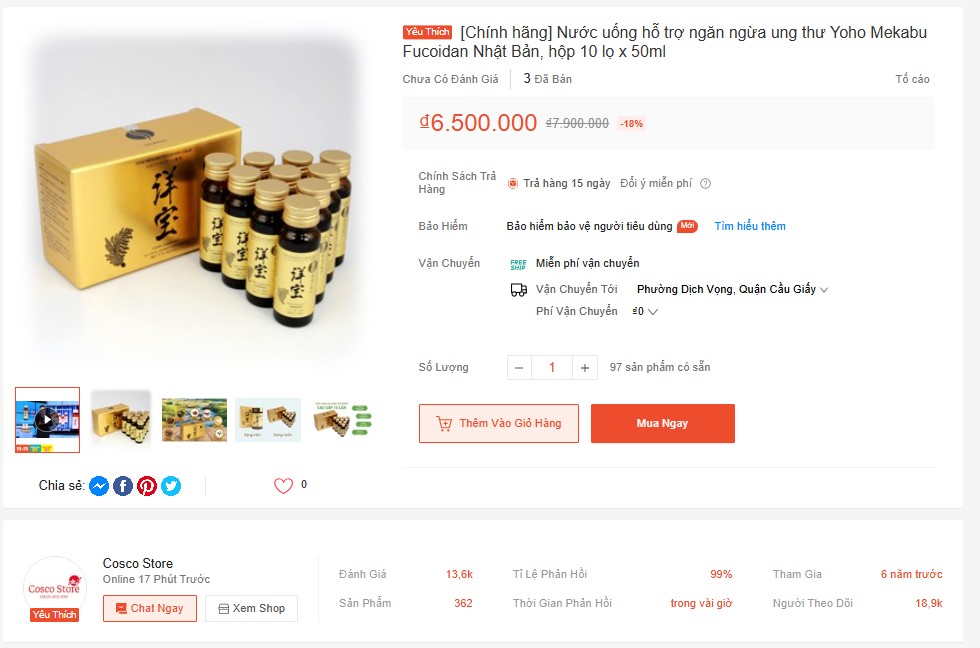 | Nước uống hỗ trợ ngăn ngừa ung thư Yoho Mekabu Fucoidan Nhật Bản hộp 10 lọ x 50ml được rao bán với mức giá tới 6.500.000 đồng. Ảnh chụp màn hình ngày 1/11 |