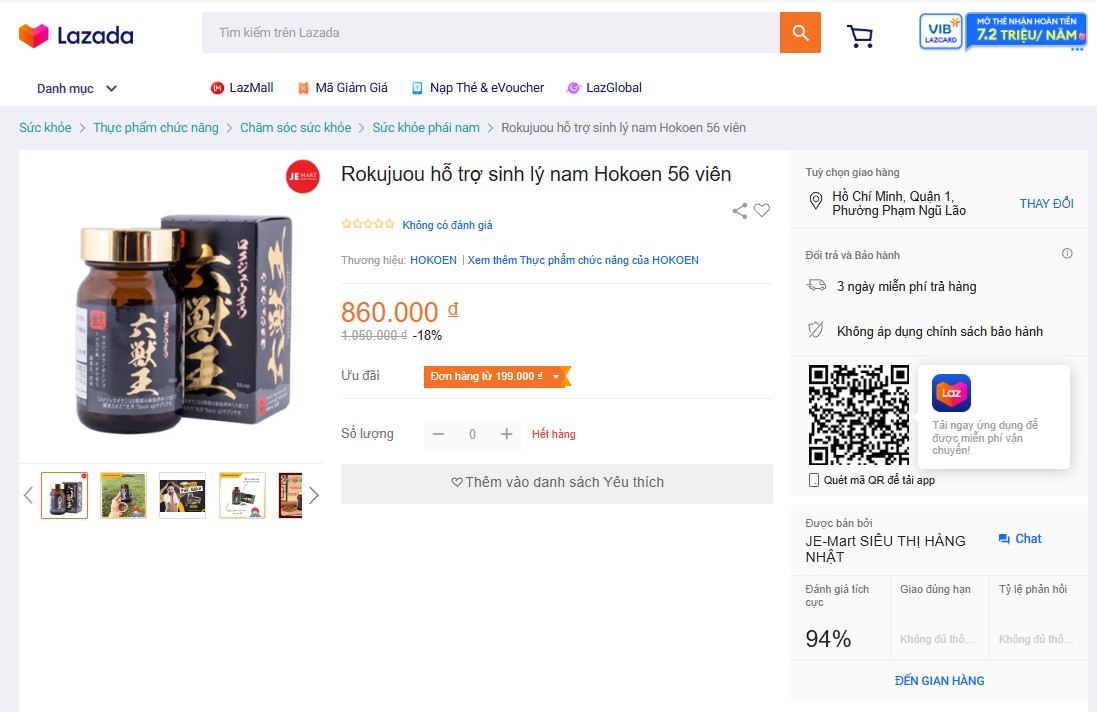 | Trên Lazada, sản phẩm Rokujuou hỗ trợ sinh lý nam Hokoen 56 viên được rao bán với mức giá 860.000 đồng. Ảnh chụp màn hình ngày 1/11 |