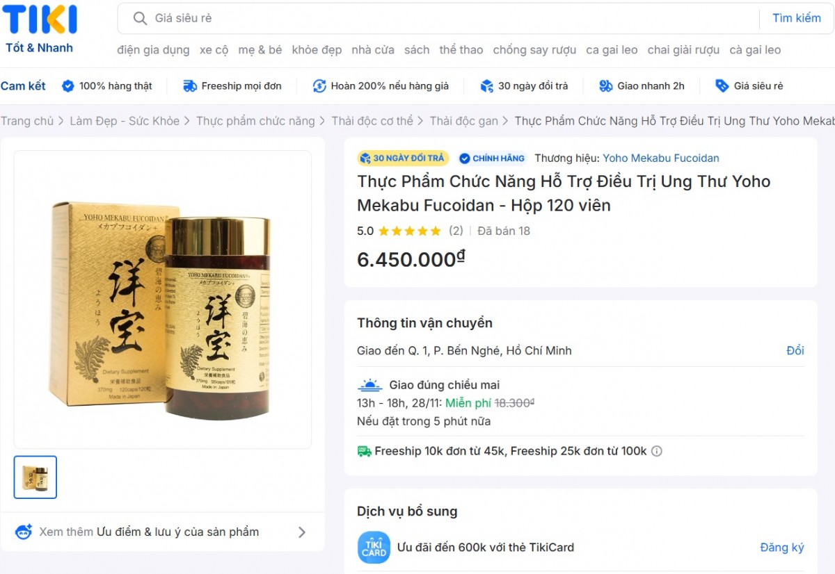 Đơn cử như trên sàn thương mại điện tử Tiki, “Thực phẩm chức năng hỗ trợ điều trị ung thư Yoho Mekabu Fucoidan - Hộp 120 viên” đang được sàn này rao bán với giá 6.450.000 đồng/sản phẩm. Đáng nói, ở phần mô tả, sản phẩm này còn được quảng cáo như thuốc: “Thuốc sẽ ức chế sự hình thành mạch máu mới quanh các tế bào ung thư, khiến các tế bào này mất đi nguồn cung cấp chất dinh dưỡng, từ đó tế bào ưng thư không thể di căn”.