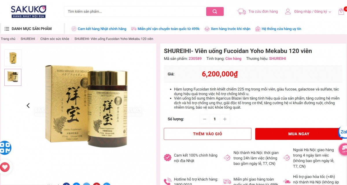 Tại website của SAKUKO – hàng nội địa Nhật, sản phẩm viên uống “Yoho Mekabu Fucoidan 120 viên” đang được niêm yết với giá bán là 6.200.000 đồng/sản phẩm. Website này cam kết 100% là hàng chính hãng, nội địa Nhật. Qua trao đổi trên zalo liên kết với website, đơn vị này cho biết, hiện tại đã dừng nhập mặt hàng này vì bán chậm.