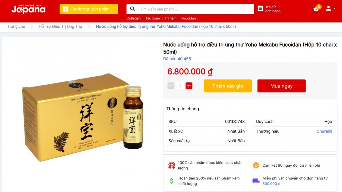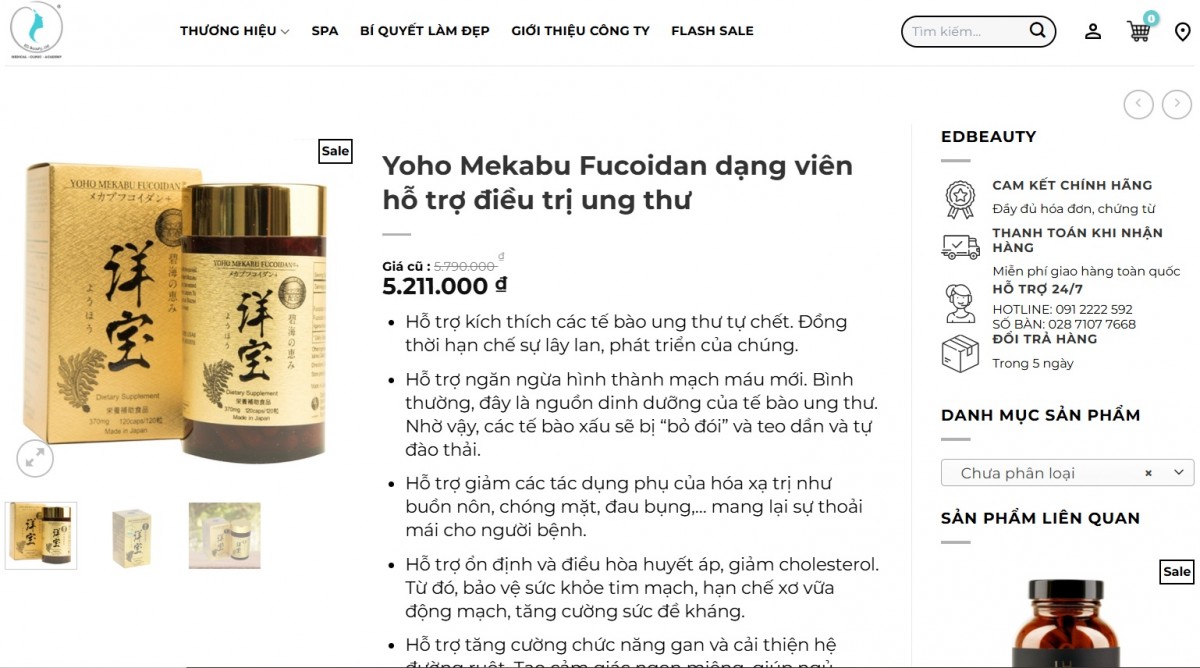 Còn tại website bán hàng của Công ty TNHH Y Dược ED Beauty, sản phẩm “Yoho Mekabu Fucoidan dạng viên hỗ trợ điều trị ung thư” được bán với giá 5.211.000 đồng/sản phẩm. Còn sản phẩm “Nước uống hỗ trợ ngăn ngừa ung thư Yoho Mekabu Fucoidan Nhật Bản hộp 10 lọ x 50ml” có giá 6.590.000 đồng, hiện giảm giá còn 5.931.000 đồng. Website này khẳng định, cả 2 sản phẩm kể trên đều được nhập khẩu chính hãng, đầy đủ hóa đơn, chứng từ.