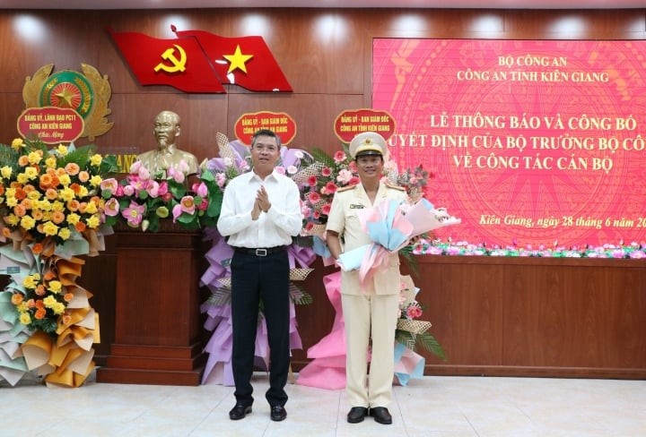 | Ông Nguyễn Lưu Trung, Phó Chủ tịch UBND tỉnh Kiên Giang, tặng hoa chúc mừng tân Phó Giám đốc Công an tỉnh Kiên Giang. (Ảnh: CAKG). |