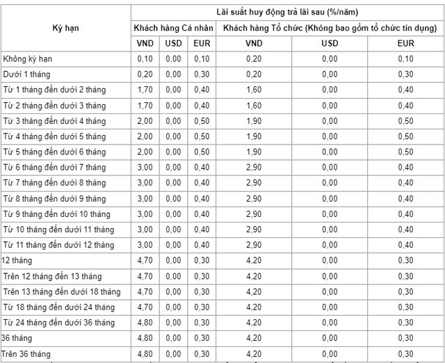 Theo biểu lãi suất tiết kiệm dành cho khách hàng doanh nghiệp, mức lãi suất tiết kiệm hiện dao động từ 1,6%/năm đến 4,2%/năm áp dụng cho hình thức nhận lãi cuối kỳ.