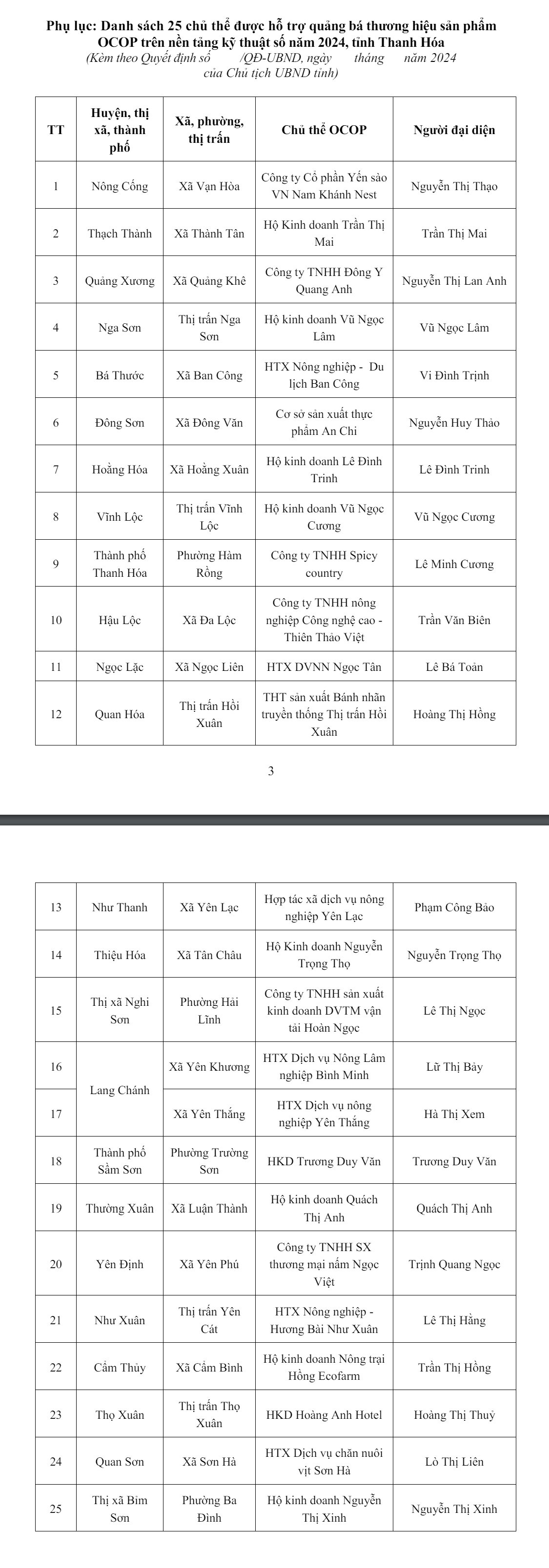 | Danh sách 25 chủ thể được hỗ trợ quảng bá thương hiệu sản phẩm OCOP trên nền tảng kỹ thuật số năm 2024 trên địa bàn tỉnh Thanh Hóa. |