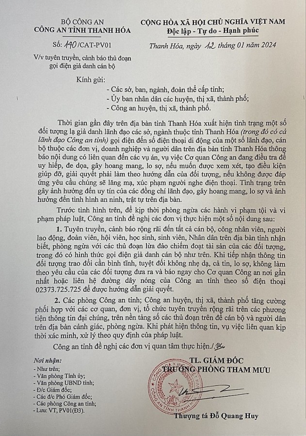 | Công an tỉnh Thanh Hóa đã phát đi văn bản để tuyên truyền, cảnh báo thủ đoạn gọi điện giả danh cán bộ |