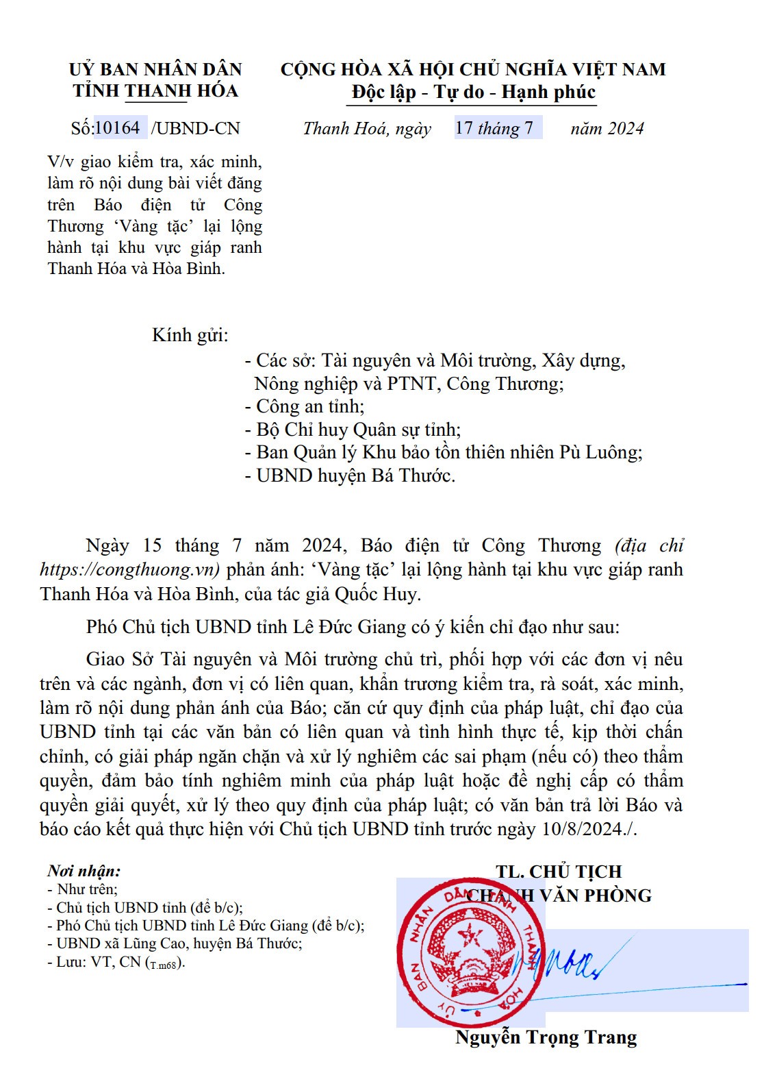 Ngay sau khi tiếp nhận thông tin, ngày 17/7/2024, UBND tỉnh Thanh Hóa đã ban hành văn bản 10164/UBND-CN giao Sở Tài nguyên và Môi trường chủ trì, phối hợp với các ngành, đơn vị có liên quan, khẩn trương kiểm tra, rà soát, xác minh, làm rõ nội dung phản ánh của Báo Công Thương; căn cứ quy định của pháp luật, chỉ đạo của UBND tỉnh tại các văn bản có liên quan và tình hình thực tế, kịp thời chấn chỉnh, có giải pháp ngăn chặn và xử lý nghiêm các sai phạm (nếu có) theo thẩm quyền, đảm bảo tính nghiêm minh của pháp luật hoặc đề nghị cấp có thẩm quyền giải quyết, xử lý theo quy định của pháp luật; có văn bản trả lời Báo và báo cáo kết quả thực hiện với Chủ tịch UBND tỉnh.