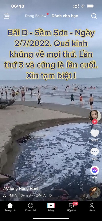 Vừa qua, trên mạng xã hội Facebook của chủ tài khoản có tên Vương Hồng Hạnh quay cảnh tại bãi D biển Sầm Sơn (Thanh Hóa) xả thải bẩn ra bãi biển. Cụ thể: tài khoản viết: “Bãi D - Sầm Sơn - ngày 2/7/2022. Quá kinh khủng về mọi thứ. Lần thứ 3 và cũng là lần cuối. Xin tạm biệt!”.