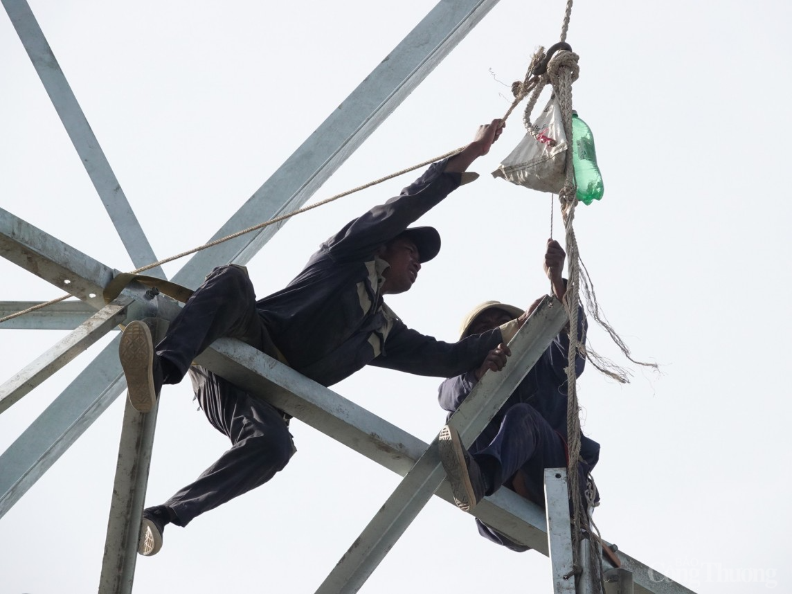 | Một nhóm công nhân phơi mình trên độ cao hàng chục mét để lắp đặt cột, quyết tâm đưa đường dây 500kV mạch 3 về đúng tiến độ (Ảnh: Quốc Huy) |