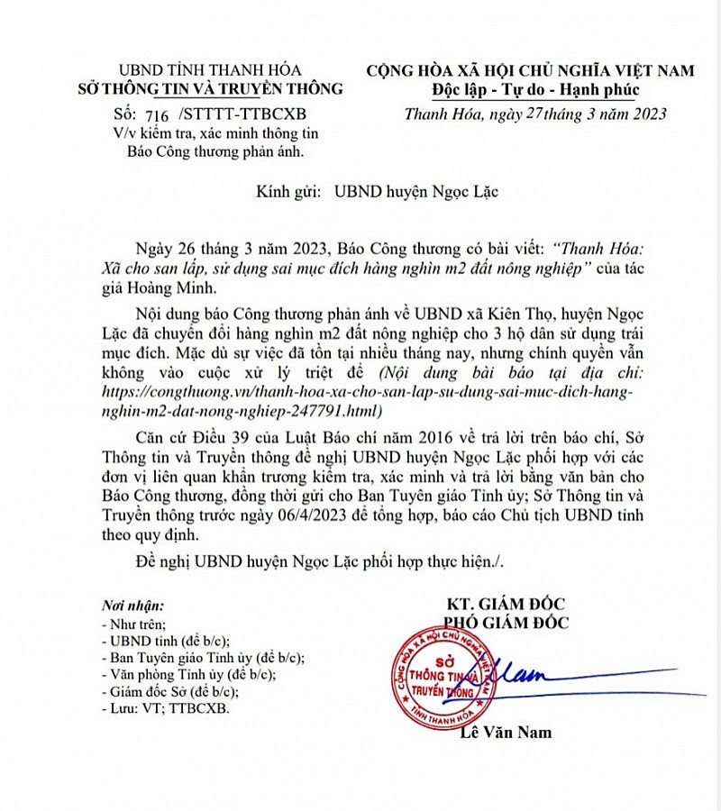 | Sở Thông tin và Truyền thông Thanh Hóa đề nghị UBND huyện Ngọc Lặc phối hợp với các đơn vị liên quan khẩn trương kiểm tra, xác minh và trả lời bằng văn bản cho Báo Công Thương, đồng thời gửi cho Ban Tuyên giáo tỉnh ủy; Sở Thông tin và Truyền thông trước ngày 6/4/2023 để tổng hợp, báo cáo Chủ tịch UBND tỉnh theo quy định |