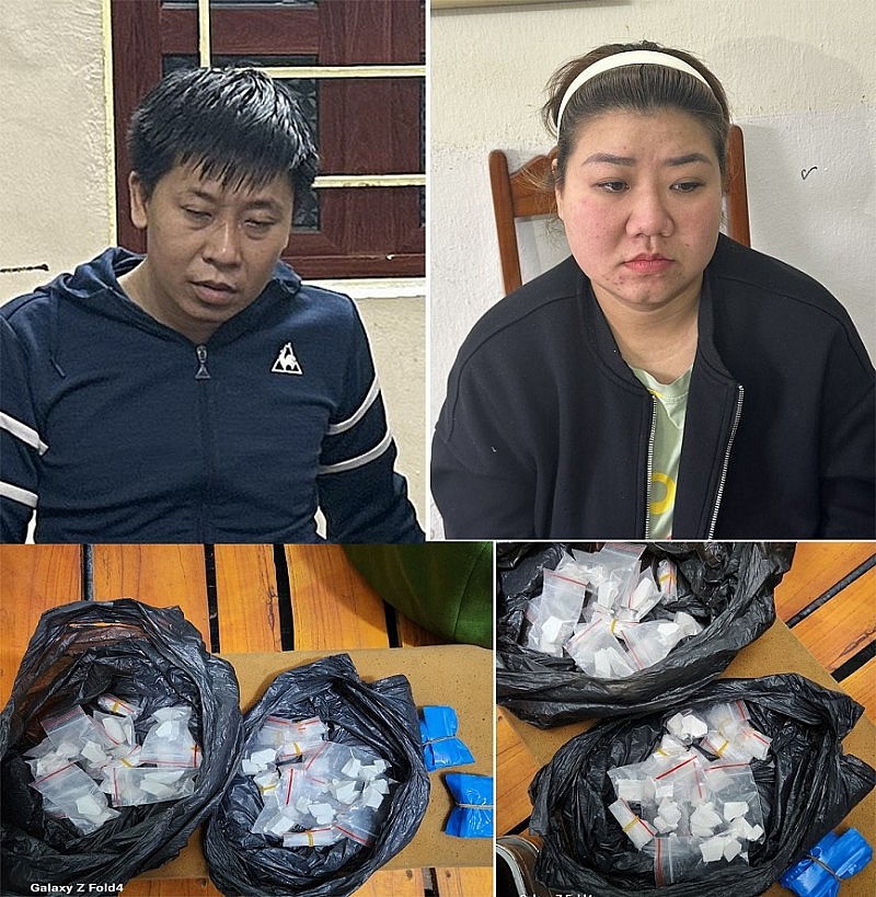 Đối tượng Nguyễn Thị An và Nguyễn Minh Đức cùng số ma túy thu giữ |