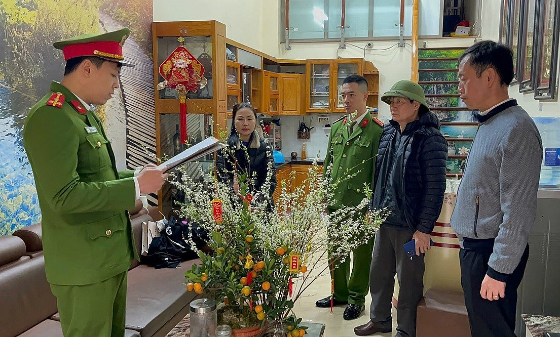 | Công an Thanh Hóa tống đạt lệnh khám xét khẩn cấp nhà của Lê Nguyên Cường. Ảnh: Công an Thanh Hóa. |