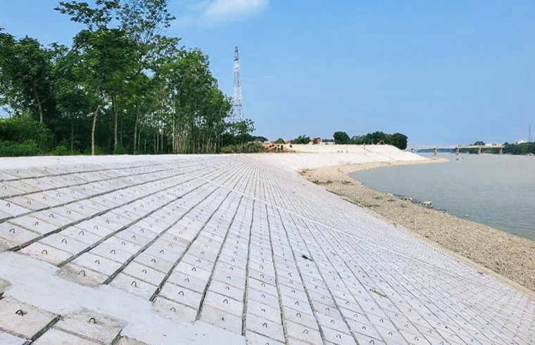 | Một trong các giải pháp đảm bảo an toàn đê điều trước mùa mưa bão là đẩy nhanh tiến độ các dự án tu bổ, nâng cấp đê điều. (Ảnh: QH) |