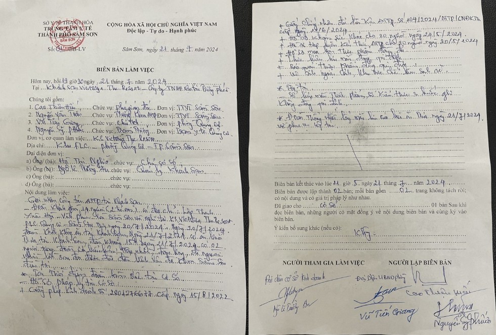 Cũng theo anh T. sau khi thông báo sự việc đến cơ quan chức năng, Trung tâm Y tế TP. Sầm Sơn đã cử cán bộ xuống khu nghỉ dưỡng lập 2 biên bản làm việc, biên bản lấy mẫu để tiến hành xác minh, làm rõ sự việc.