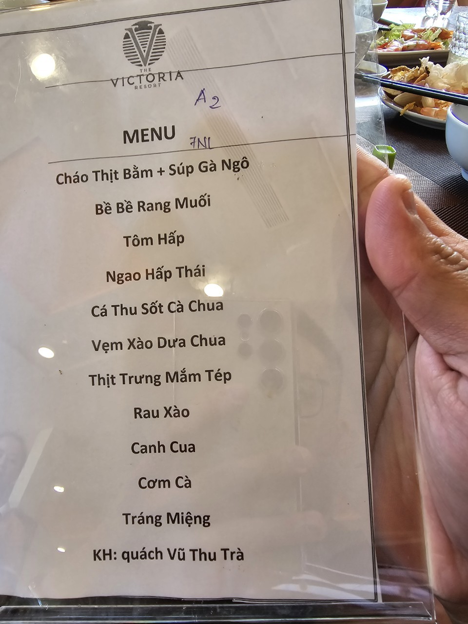 | Thực đơn bữa ăn tại The Victoria Resort Sầm Sơn. (Ảnh: Du khách cung cấp) |
