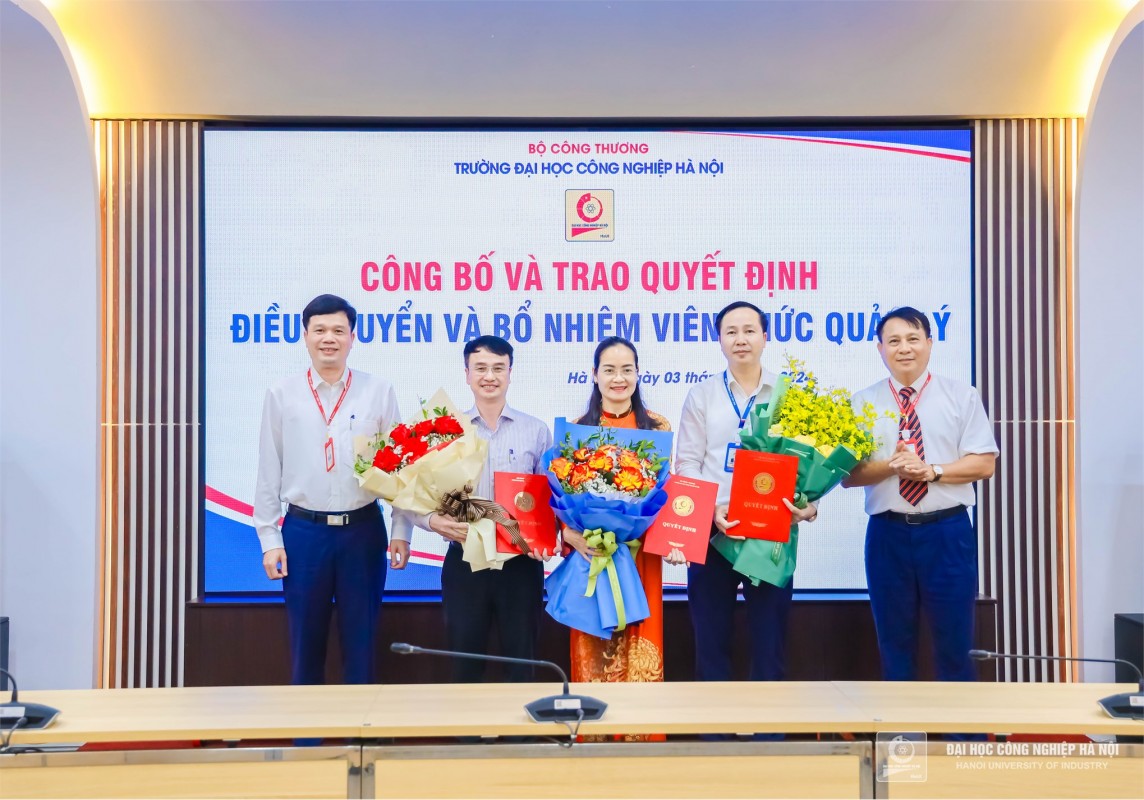 Gửi lời chúc mừng tới 3 viên chức quản lý được bổ nhiệm và điều động nhận nhiệm vụ mới, TS. Kiều Xuân Thực – Hiệu trưởng Trường Đại học Công nghiệp Hà Nội nhấn mạnh về đổi mới sáng tạo, sự gắn kết chia sẻ của cán bộ, viên chức, người lao động để hoàn thành xuất sắc nhiệm vụ được giao, đáp ứng yêu cầu của mô hình quản trị mới. Nghiên cứu xây dựng chế độ chính sách thu hút và giữ chân người tài thực hiện thắng lợi chiến lược phát triển của Trường Đại học Công nghiệp Hà Nội lên tầm cao mới.