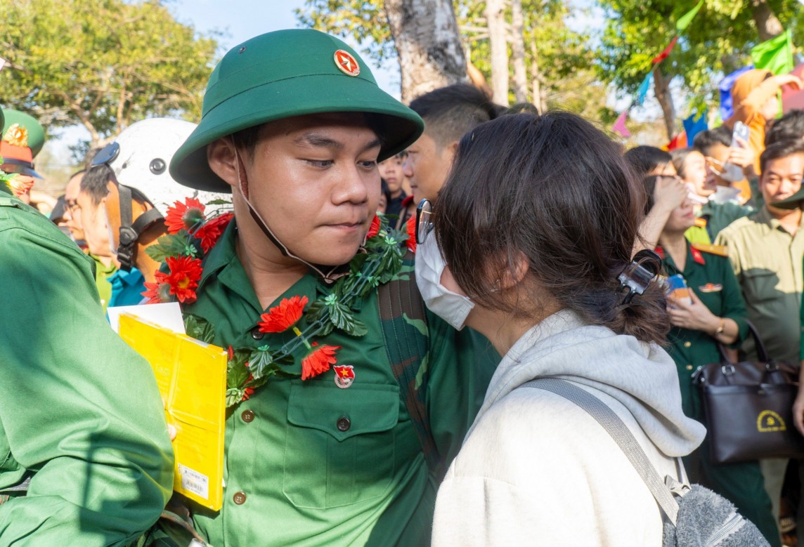 | Các tân binh chào gia đình, bạn bè trước khi lên xe di chuyển về đơn vị |