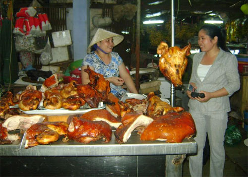 | Kiểm tra chất lượng thịt heo tại chợ. Ảnh minh họa |