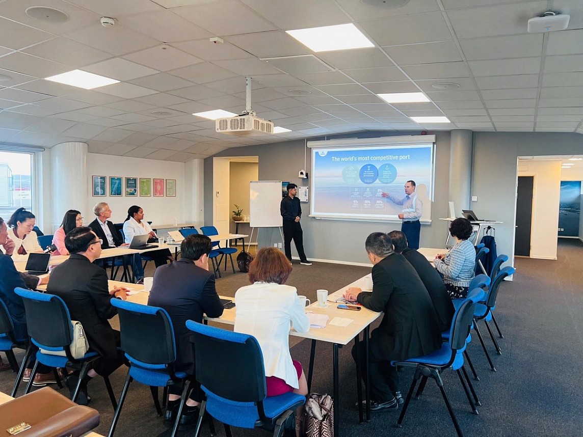 | Ông Richard Mellgren (đứng, bên phải) giới thiệu cảng Gothenburg (Ảnh: Thương vụ Việt Nam tại Thuỵ Điển) |
