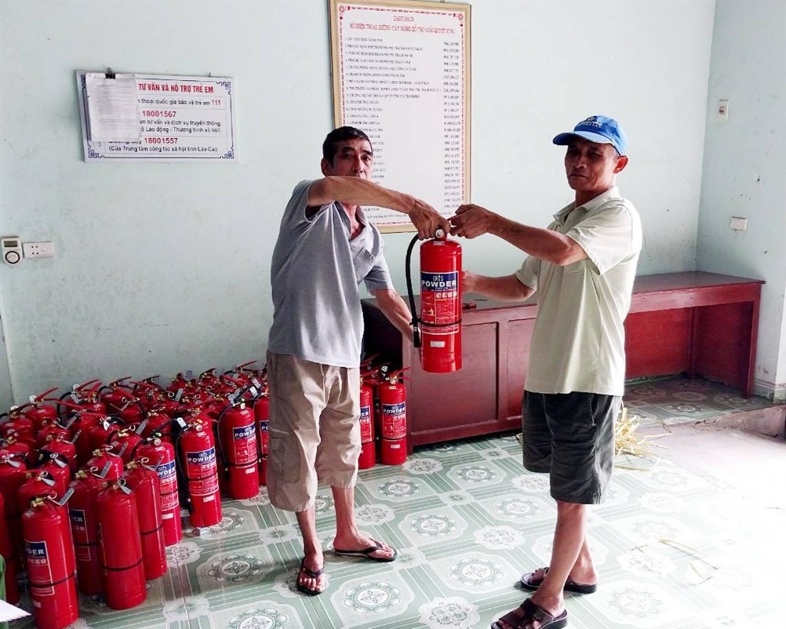 Các hộ dân ở phường Kim Tân, thành phố Lào Cai trang bị bình chữa cháy (Ảnh: CALC) |