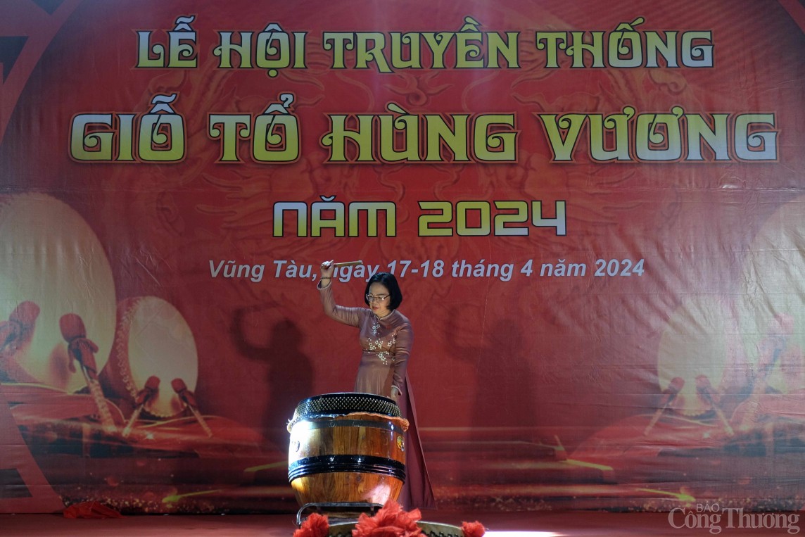 | Bà Nguyễn Thị Thu Hương, Phó Chủ tịch UBND TP. Vũng Tàu đánh trống khai mạc ngày hội truyền thống Giỗ Tổ Hùng Vương. |
