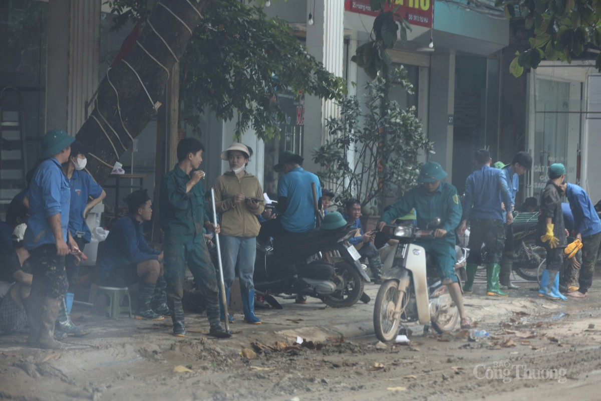 | Các hộ gia đình cùng lực lượng Quân đội, Công an đang khẩn trương dọn dẹp nhà cửa, đường sá sau lũ lụt |
