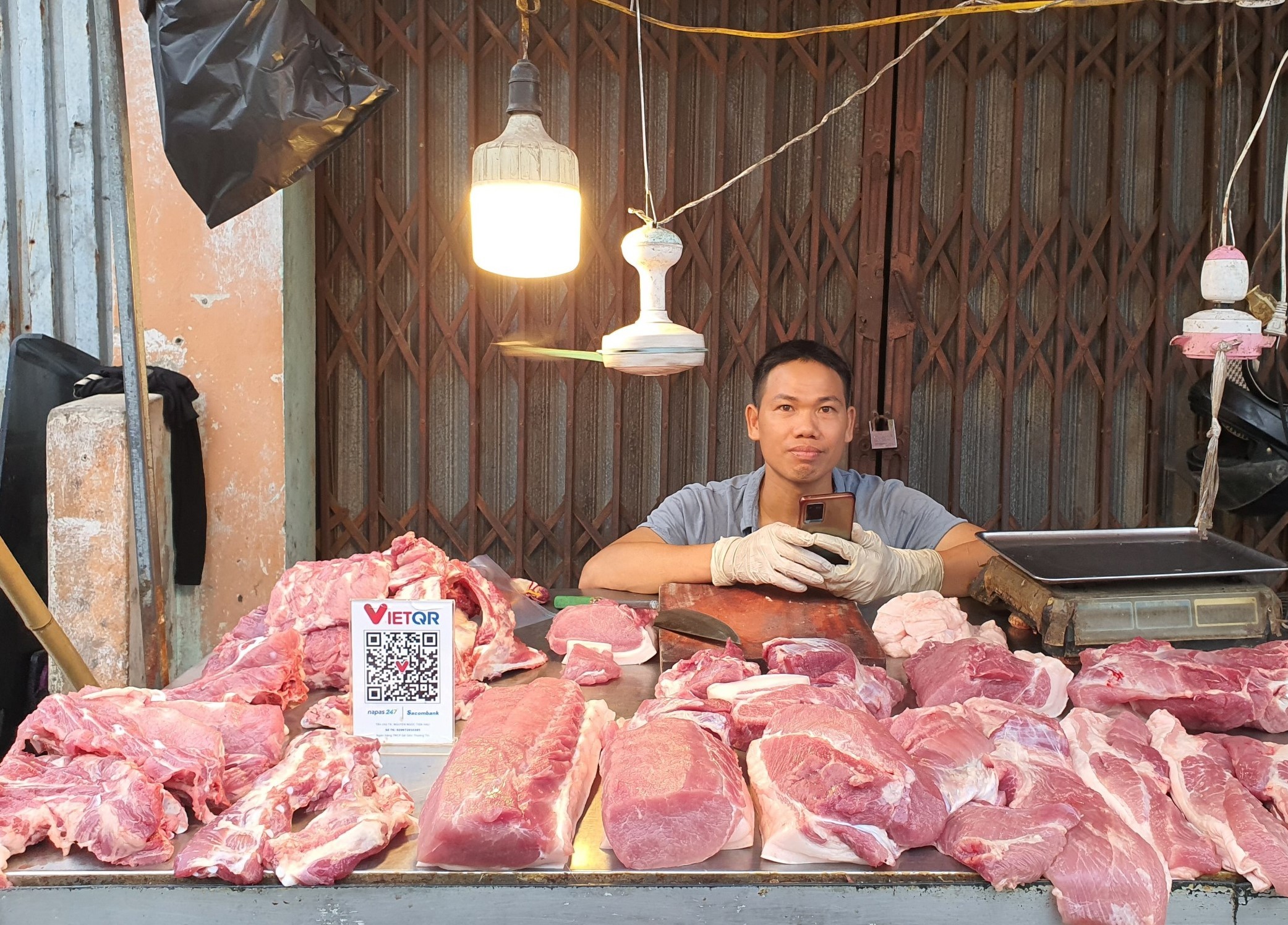 | Tại các chợ dân sinh hầu hết các tiểu thương đều có mã QR để thanh toán điện tử |
