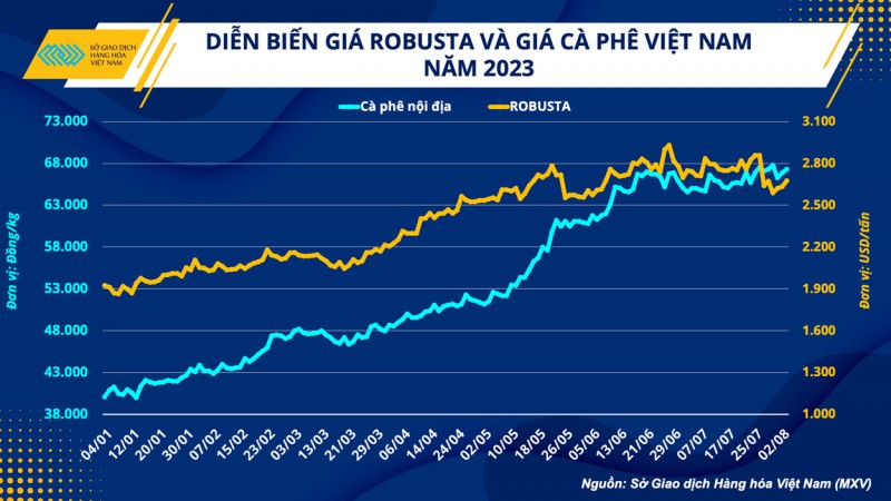 | Diễn biến giá robusta và giá cà phê Việt Nam năm 2023 |
