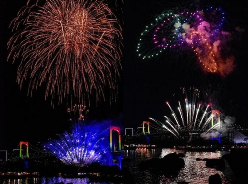 Pháo hoa bừng sáng bầu trời Tokyo, Nhật Bản trong bức ảnh chụp từ quận Odaiba. Ảnh: AusDish |