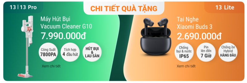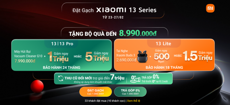 Khi đặt trước bộ đôi siêu phẩm Xiaomi 13 và Xiaomi 13 Pro, bên cạnh chính sách bảo hành 1 đổi 1 trong vòng 24 tháng, khách hàng sẽ được giảm thẳng 5.000.000 hoặc tặng máy hút bụi Vaccum Cleaner G10 trị giá 7.990.000đ và được giảm thêm 1 triệu đồng.