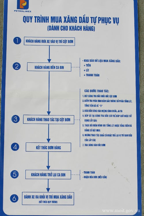 Theo như hình thức kinh doanh xăng dầu tự phục vụ, người mua xăng chỉ cần thực hiện 6 bước đơn giản: khách hàng đưa xe vào vị trí cột bơm; đến cabin khai báo dữ liệu mua xăng dầu, loại, số tiền; khách hàng thao tác tại cột bơm; kết thúc bơm hàng; khách hàng trở lại cabin; đánh xe ra khỏi vị trí mua xăng dầu.