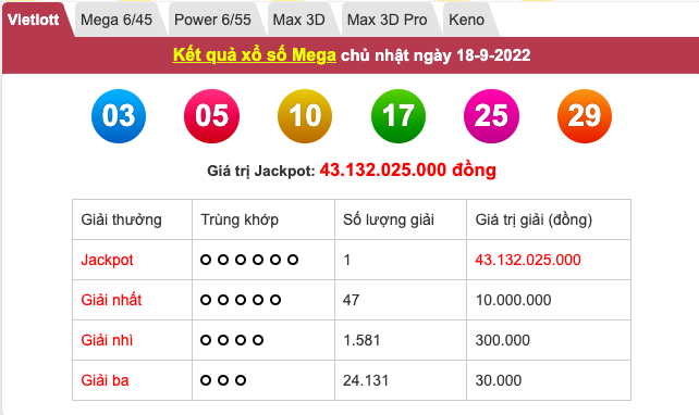 Cụ thể, trong kỳ quay số mở thưởng lần thứ 942 của sản phẩm Mega 6/45 diễn ra vào tối 18/9/2022, Hội đồng quay thưởng của Vietlott đã xác định có 1 vé số đã trúng giải Jackpot trị giá 43.132.025.000 đồng với dãy số may mắn là: 03 - 05 - 10 - 17 - 25 - 29.